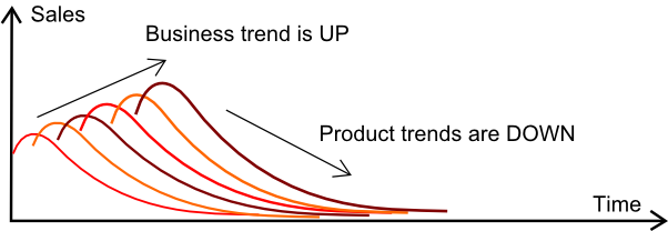 This is a set of product sales plotted on the same graphic. Each curve is associated to a particular product; and products are launched over time. Each product come with its own lifecycle pattern. The lifecycle patterns here illustrate a typical novelty effect: sales quickly ramp-up after product launch, and then the product enters its downward phase, which ends when the product is finally phased out of the market.
