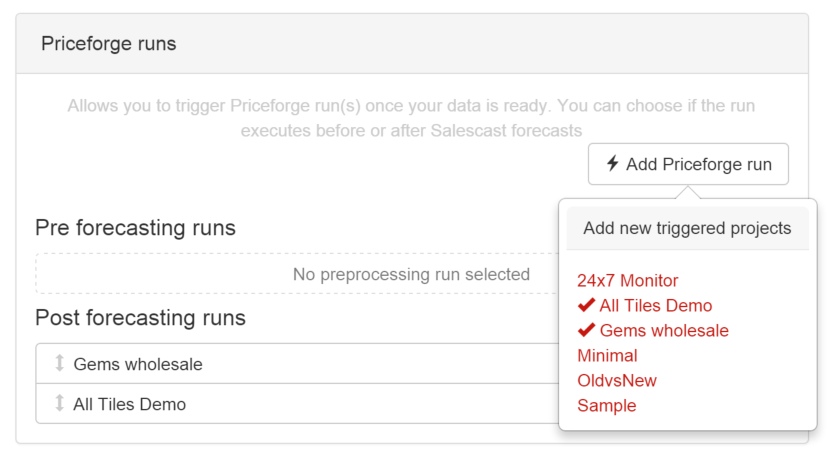 The built-in dashboards of Salescast were already a step in this direction, and today, we take another step. It’s now possible to configure a Salescast project to execute a specific sequence of Priceforge projects.