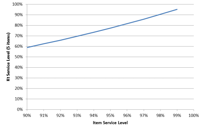 Per esempio, con 5 articoli aventi un livello di servizio del 90%, il kit risulta con un livello di servizio leggermente inferiore al 60%. Questo comportamento illustra il comportamento da anello debole dei kit: basta che un solo articolo sia esaurito per rendere esaurito l’intero kit. Anche se tutti gli articoli hanno una disponibilità piuttosto elevata, la disponibilità del kit può essere molto più bassa; e più grande è il kit, peggio è. Se invece di 5 articoli, consideriamo un kit con 10 articoli al 90% di livello di servizio, allora la disponibilità del kit si riduce al 35%; il che è tipicamente inaccettabile per la maggior parte delle aziende.